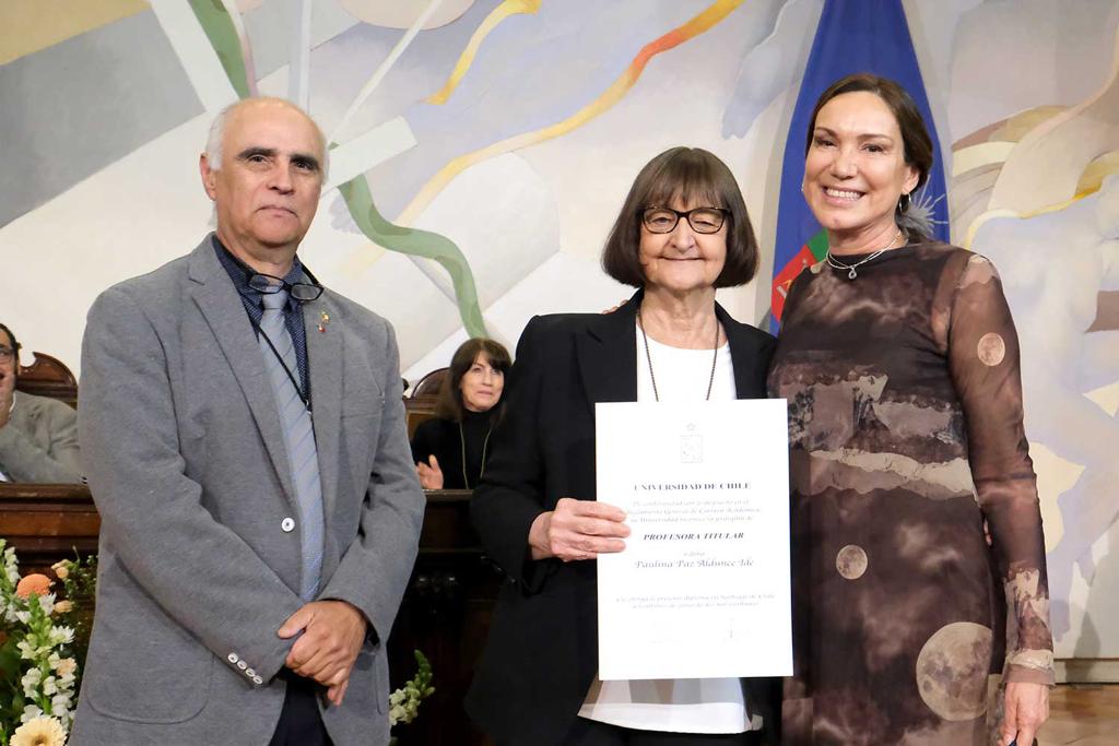 En la oportunidad, se hizo entrega de la Medalla Rectoral a los Premios Nacionales 2023 que estudiaron o pertenecieron a la comunidad de la Universidad de Chile y se distinguió con un diploma y medalla a 28 académicos y académicas que alcanzaron el grado de Profesor Titular entre marzo de 2022 y enero de 2023, la más alta jerarquía que un/a académico/a puede alcanzar en la Universidad de Chile. De nuestra Facultad de Ciencias Agronómicas recibió la medalla, la Profesora Titular Paulina Aldunce Ide.