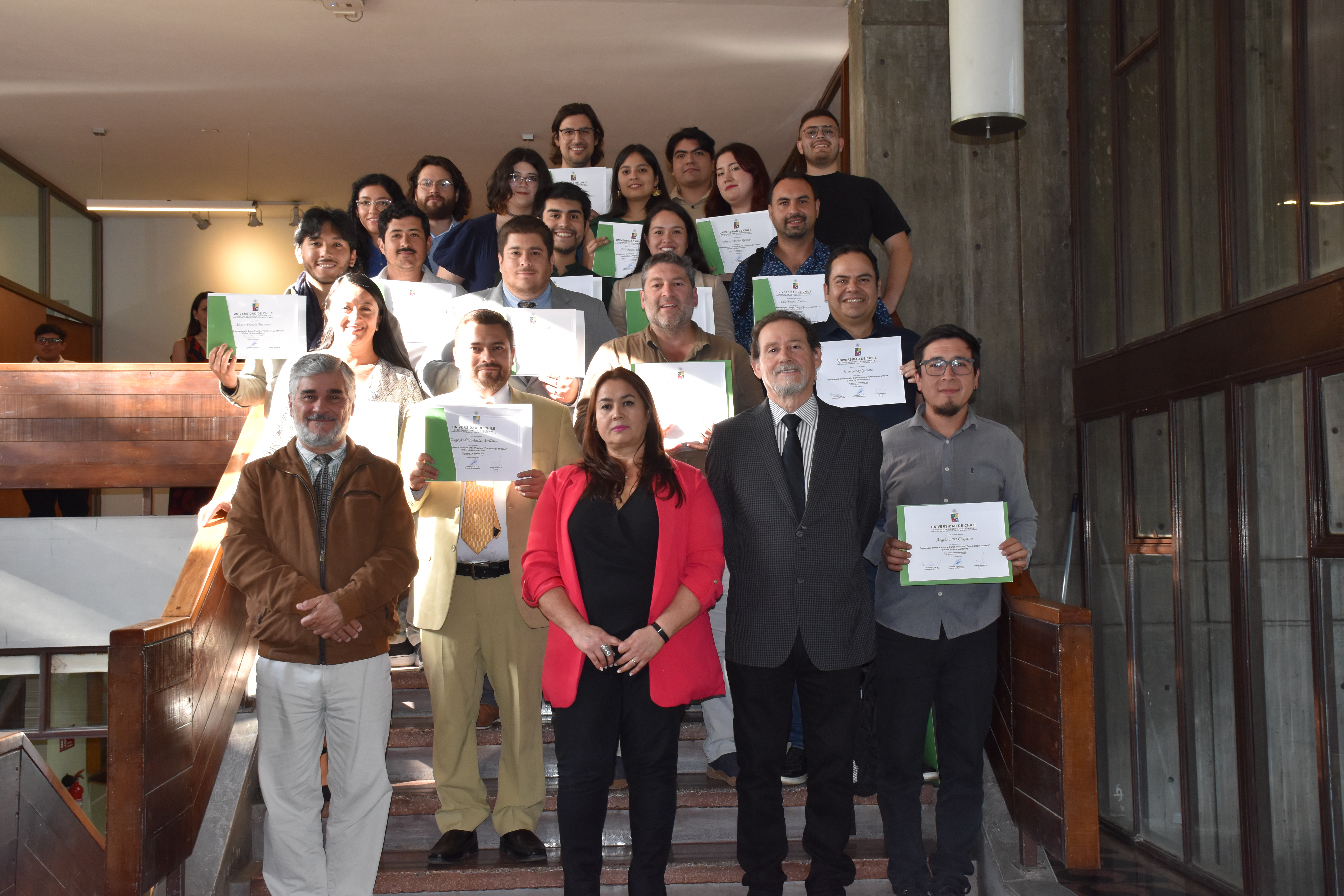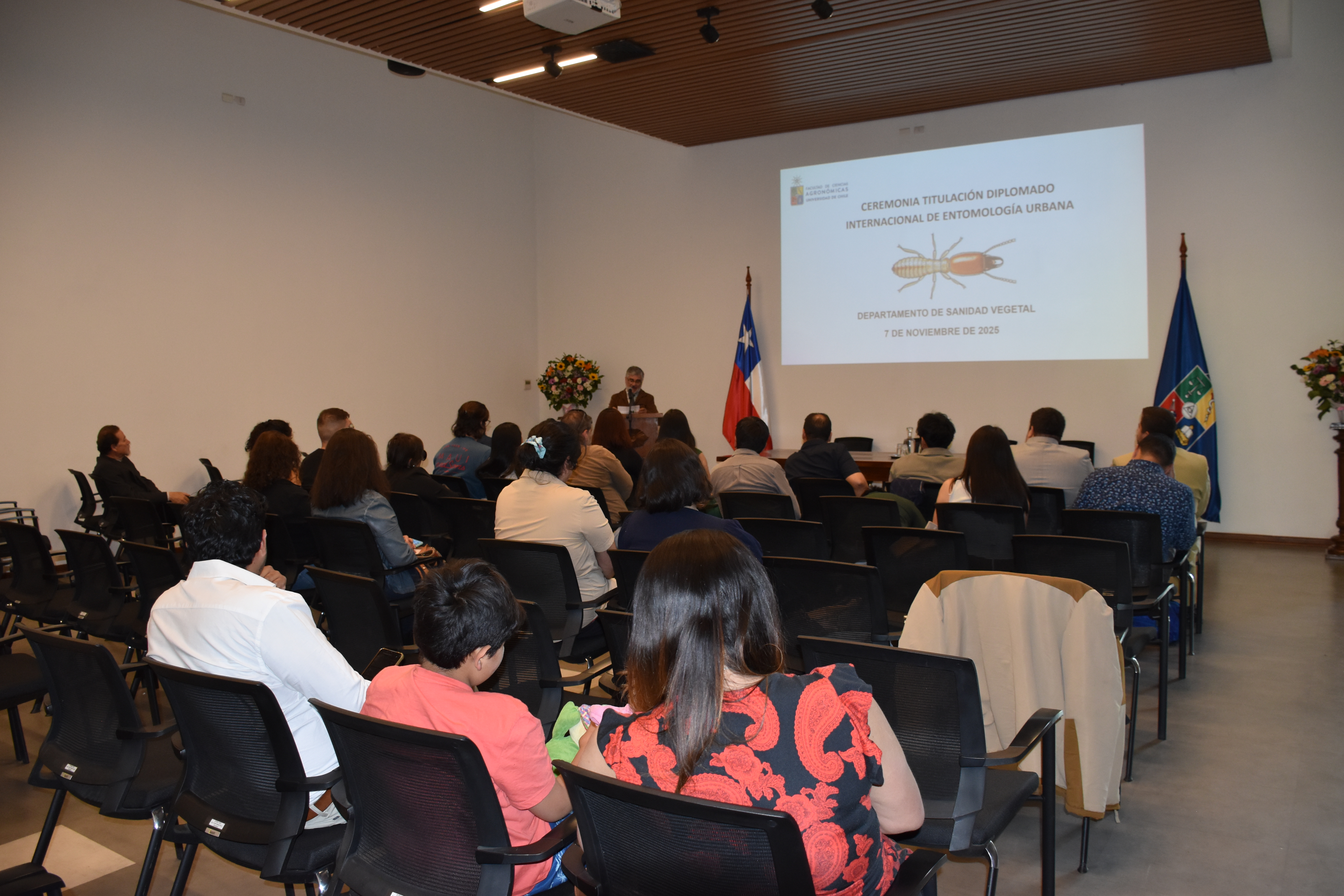 Con una alta convocatoria nacional e internacional, el pasado 7 de noviembre se llevó a cabo la ceremonia de cierre del Diplomado Internacional de Entomología Urbana, en la Sala Roberto Opazo de la Facultad de Ciencias Agronómicas de la Universidad de Chile. La instancia reunió a 17 egresados —incluyendo representantes de seis países— junto a docentes, autoridades y profesionales del área, quienes destacaron el crecimiento y relevancia de este programa académico especializado, dirigido por el profesor Tomislav Curkovic, académico de nuestra Facultad.